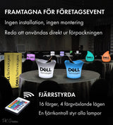 Våra lampor och bordsdekorationer är framtagna för företagsevent. Ingen montering krävs. De är fjärrstyrda, och har 16 färgalternativ.